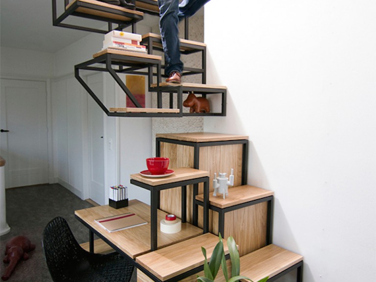 Questa è l’idea che ha portato Mieke Meijer a creare Objet élevé, un sistema a tre parti che fornisce anche lo spazio per lavorare, delle scaffalature e uno spazio di archiviazione, oltre alla funzione principale di collegare due piani.