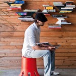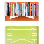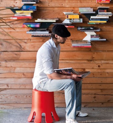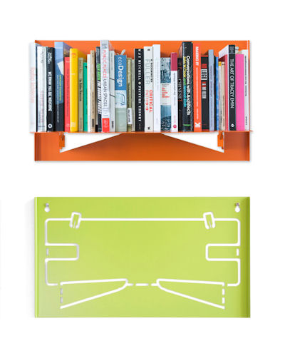 Fin di B-line Una mensola modulare in acciaio verniciato. La forma particolare permette di avere delle composizioni di libri diverse da quella classica. In questo modo i libri diventano oggetti di arredamento che galleggiano sulle pareti in forme sempre diverse.