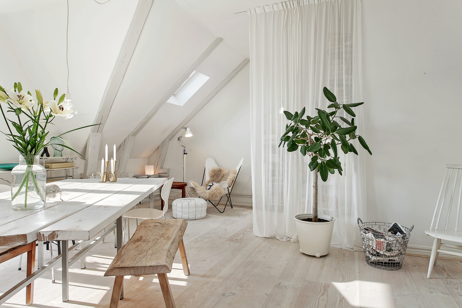 Nell’immagine sopra, piante e vasi di fiori sono distribuiti in tutta la casa, per il resto arredata e decorata con il bianco e il legno naturale. La mansarda è illuminata dalla luce che arriva dalle finestre per tetti e che viene riflessa negli specchi appesi sulle pareti.