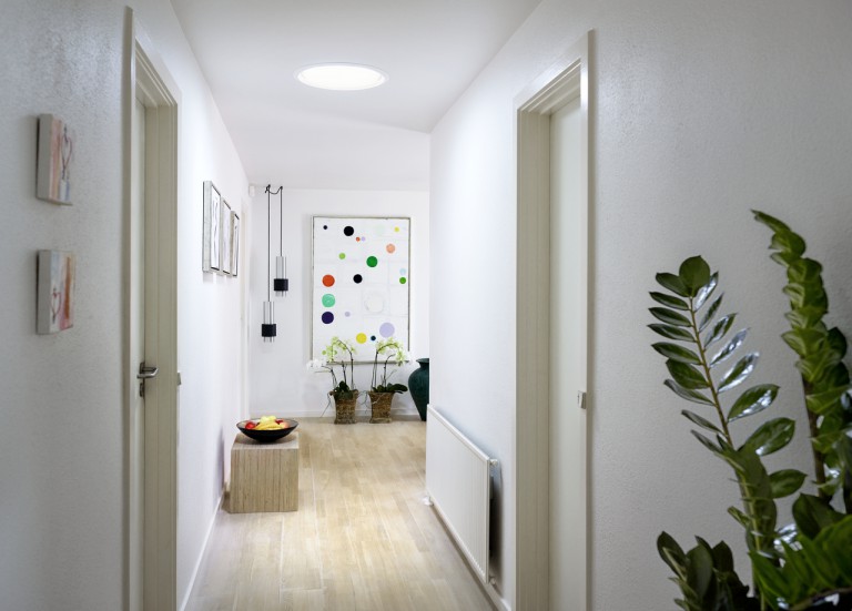 In questo caso il tunnel solare VELUX permette di raccogliere e fornire luce diurna nello spazio sottostante attraverso un tubo con rivestimento interno altamente riflettente. E, poiché i tunnel solari sono facili da installare, è possibile posizionarne più di uno contemporaneamente in modo da illuminare l’intera lunghezza del corridoio.